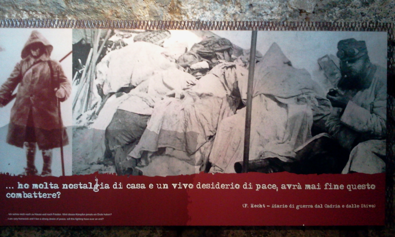 Il museo di Vermiglio raccoglie la memoria di una città completamente distrutta dalla Guerra, evacuata già dal 1914 per essere occupata dai militari, come avamposto. Una memoria che passa dagli ordigni e dalle armi , qui conservate, che hanno trasformato per sempre il concetto di guerra. Bombe, mitragliatrici, cannoni… una guerra che proprio la tecnologia ha reso ancora più cruenta. Insieme a queste, tutti gli oggetti dell’equipaggiamento dei soldati, dal vestiario agli oggetti personali che raccontano le logoranti attese della guerra di trincea. Insieme ai giovani di Rondine sono state le lettere dei soldati dal fronte: pagine di grande intensità che raccontano la nostalgia dei propri cari, il desiderio di tornare a casa, la paura, il dolore e la consapevolezza che la propria sopravvivenza è legata alla morte dell’altro. “Ragazzi come loro che si sono trovati a imbracciare il fucile contro un nemico sconosciuto – come ha sottolineato Iva Callegari, responsabile dell’ufficio turistico del Museo della Guerra di Vermiglio – questi giovani, infatti hanno la stessa età di molti dei soldati partiti per il fronte. Proprio questa affinità li aiuta a prendere coscienza della Grande Guerra nella sua concretezza e rende questa esperienza molto importante per la loro formazione”.