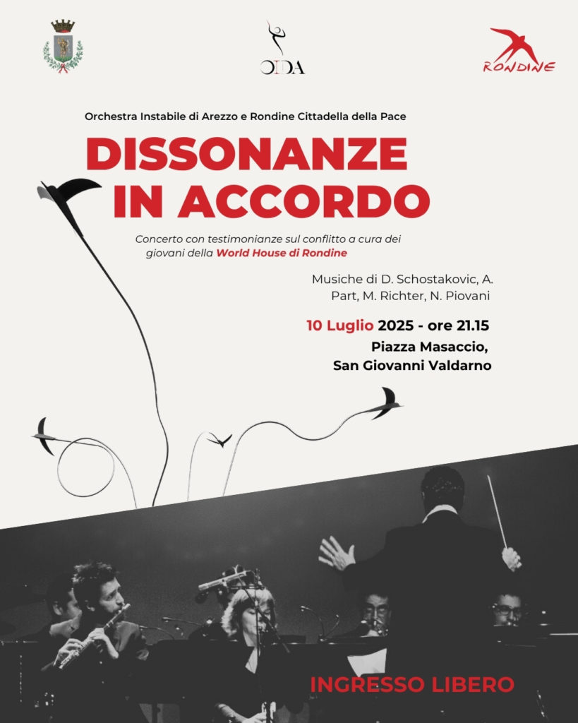 “Dissonanze in accordo – le parole del sindaco Valentina Vadi e dell’assessore alla cultura Fabio Franchi – non è soltanto uno spettacolo: è un viaggio emozionante, una riflessione collettiva, un invito a guardare l’altro con occhi nuovi. È l’occasione per scoprire il valore del dialogo, della convivenza, della comprensione reciproca. Ed è anche la testimonianza concreta di un lavoro quotidiano, paziente e visionario, che prende forma nella Cittadella della Pace di Rondine, nel cuore della Toscana, e che trova risonanza oggi in una delle piazze simbolo di San Giovanni Valdarno. Un messaggio tanto più importante in un momento storico complesso come quello attuale segnato da guerre e conflitti. Siamo davvero felici e orgogliosi di poter ospitare l’iniziativa nella nostra città”.