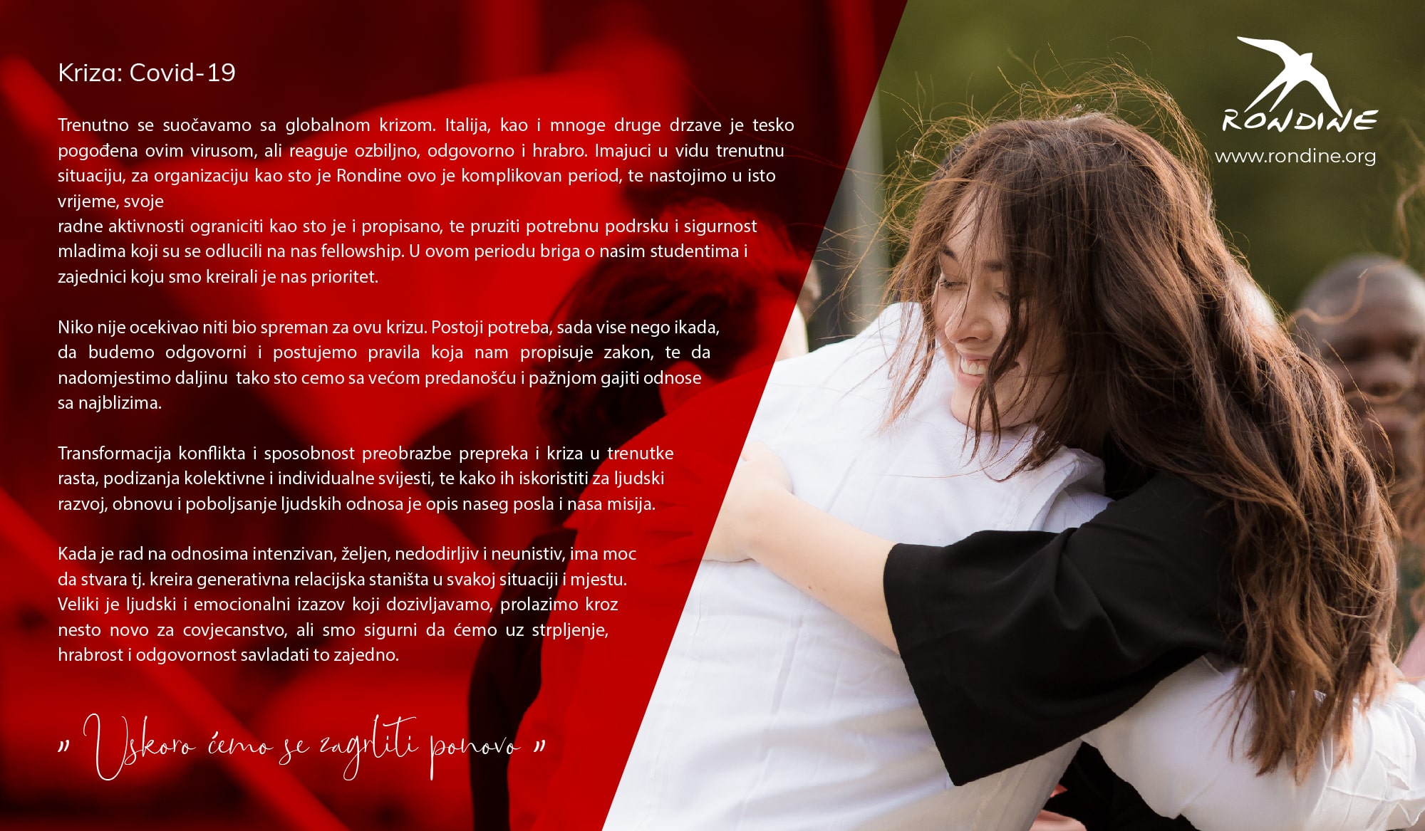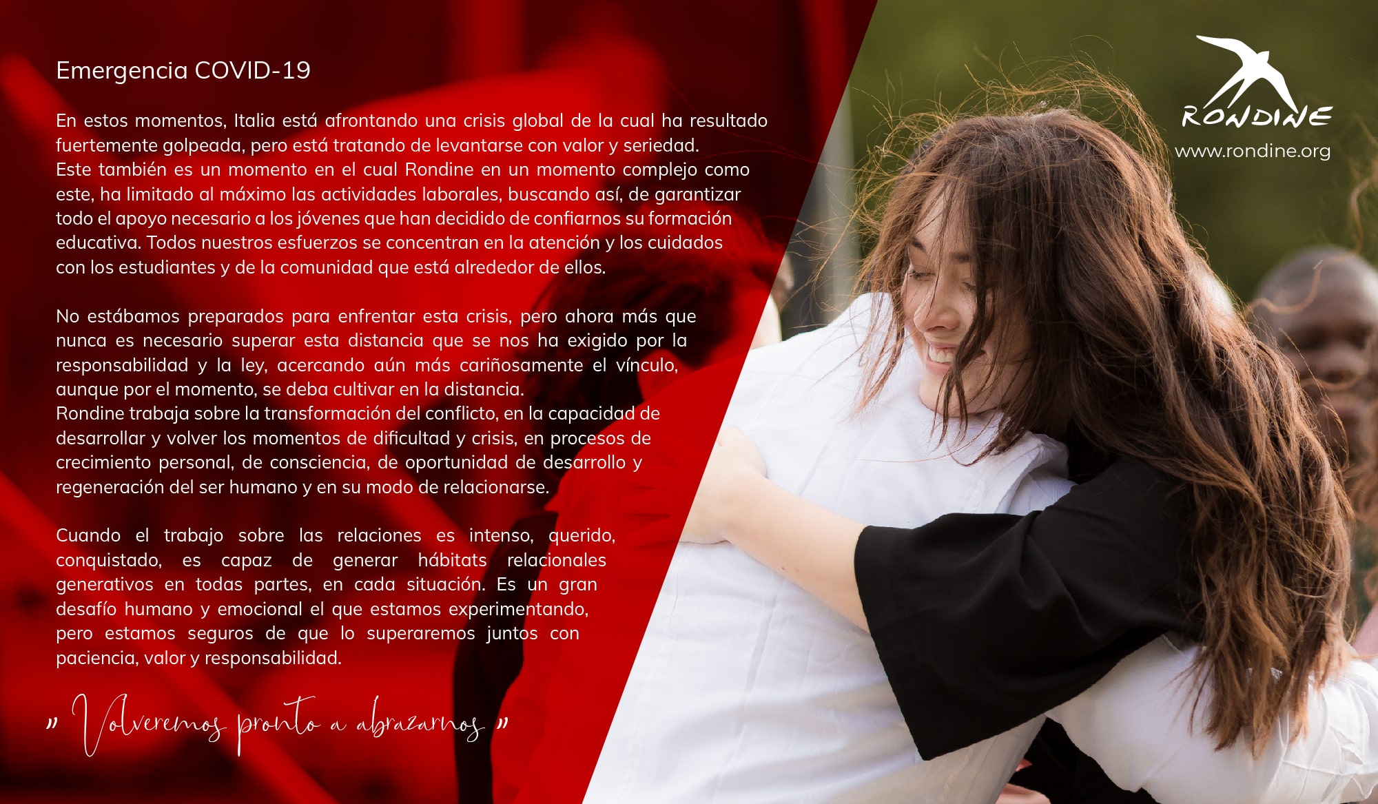 As you know, Italy and the world are now facing a global crisis. Although Italy has been severely hit, it is facing it in the most serious and courageous way. Also Rondine, in these hard and complicated times, has reduced its work hours drastically with the only purpose of making sure that our students and our community, whom entrusted themselves in our hands, stay safe, and we proudly continue to take care of them and provide everything they need.
