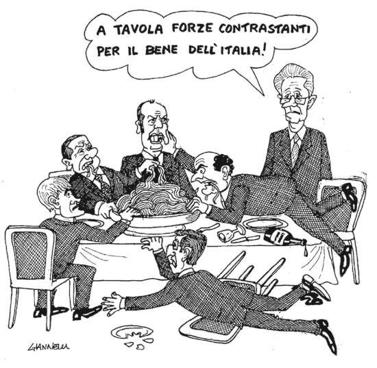 E proprio riferendosi all'esempio di Rondine citato dal premier, dove i nemici siedono quotidianamente a tavola, Giannelli ha disegnato alcuni rappresentanti politici opposti seduti attorno al tavolo e ha regalato l'originale del disegno alla Cittadella della Pace.