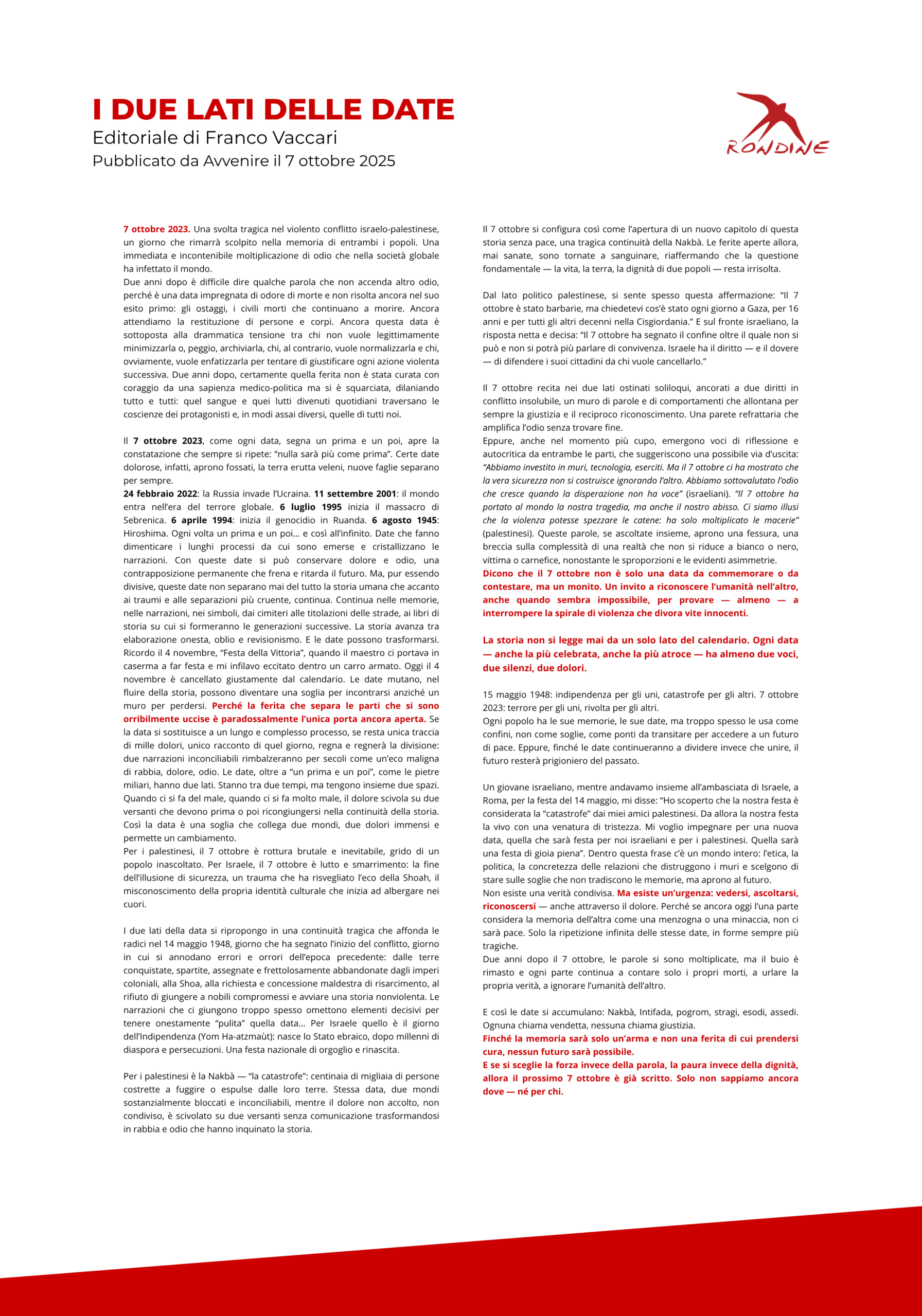 L’editoriale del presidente di Rondine Franco Vaccari, pubblicato oggi, 7 ottobre, sul quotidiano Avvenire, è stato qui di seguito tradotto in arabo e in ebraico con la collaborazione di alcuni giovani di Rondine e affisso nella Cittadella della Pace, affinché tutti possano fermarsi a leggerlo e a riflettere insieme. Un gesto simbolico che dichiara l’intenzione di restare sempre in dialogo, anche quando è molto difficile, e invita tutti al dialogo e al riconoscimento gli uni degli altri, a partire dalla condivisione del dolore.
