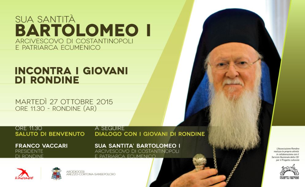 (Arezzo, 20 ottobre 2015). Sua Santità Bartolomeo I, Arcivescovo di Costantinopoli e Patriarca Ecumenico il prossimo 27 ottobre, sarà ad Arezzo ospite dell’Associazione Rondine Cittadella della Pace. Il Patriarca arriverà a Rondine alle ore 11,30 e dopo una vista della Cittadella, incontrerà i giovani dello Studentato Internazionale presso il Teatro Tenda. Il programma della visita di Bartolomeo prevede inoltre l’arrivo nel pomeriggio alla 14.30 ad Arezzo, presso la Cattedrale di San Donato di Arezzo per una visita privata, accolto dall’arcivescovo della diocesi di Arezzo-Cortona-Sansepolcro, Mons. Riccardo Fontana, Bartolomeo.
