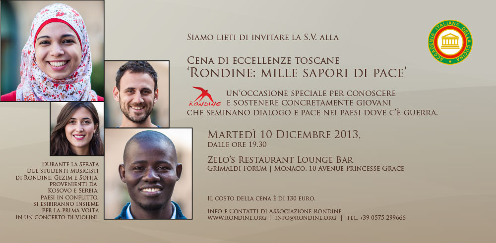 L’evento di grande prestigio si terrà martedì 10 dicembre 2013 dalle 19.30, presso lo Zelo’s Restaurant Lounge Bar, dove, grazie all’Accademia italiana della Cucina nel principato di Monaco, presieduta da Donna Fernanda Casiraghi, verrà proposta una Cena degli auguri il cui ricavato sarà devoluto a Rondine. Il menù della “Cena di Eccellenze Toscane: Rondine: mille sapori di pace”sarà a base di ingredienti e materie prime della tradizione toscana. Il Consorzio Agrario di Siena, antica cooperativa di produttori agricoli ne garantisce la qualità e l'origine territoriale.
